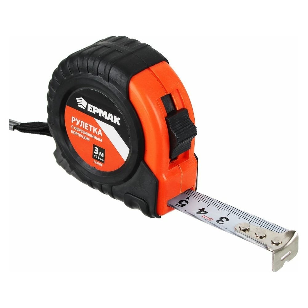 Рулетка ЕРМАК с обрезиненным корпусом, 3 м, 16 мм 658-980 предназначен для проведения измерительных работ. Надежный сматывающий механизм и корпус из ударопрочного пластика обеспечивают долгий срок службы инструмента. Комфорт в работе придают противоскользящие резиновые вставки, а для ношения - наручная петля и зацеп на ремень. Инструмент применяется в быту и строительстве.