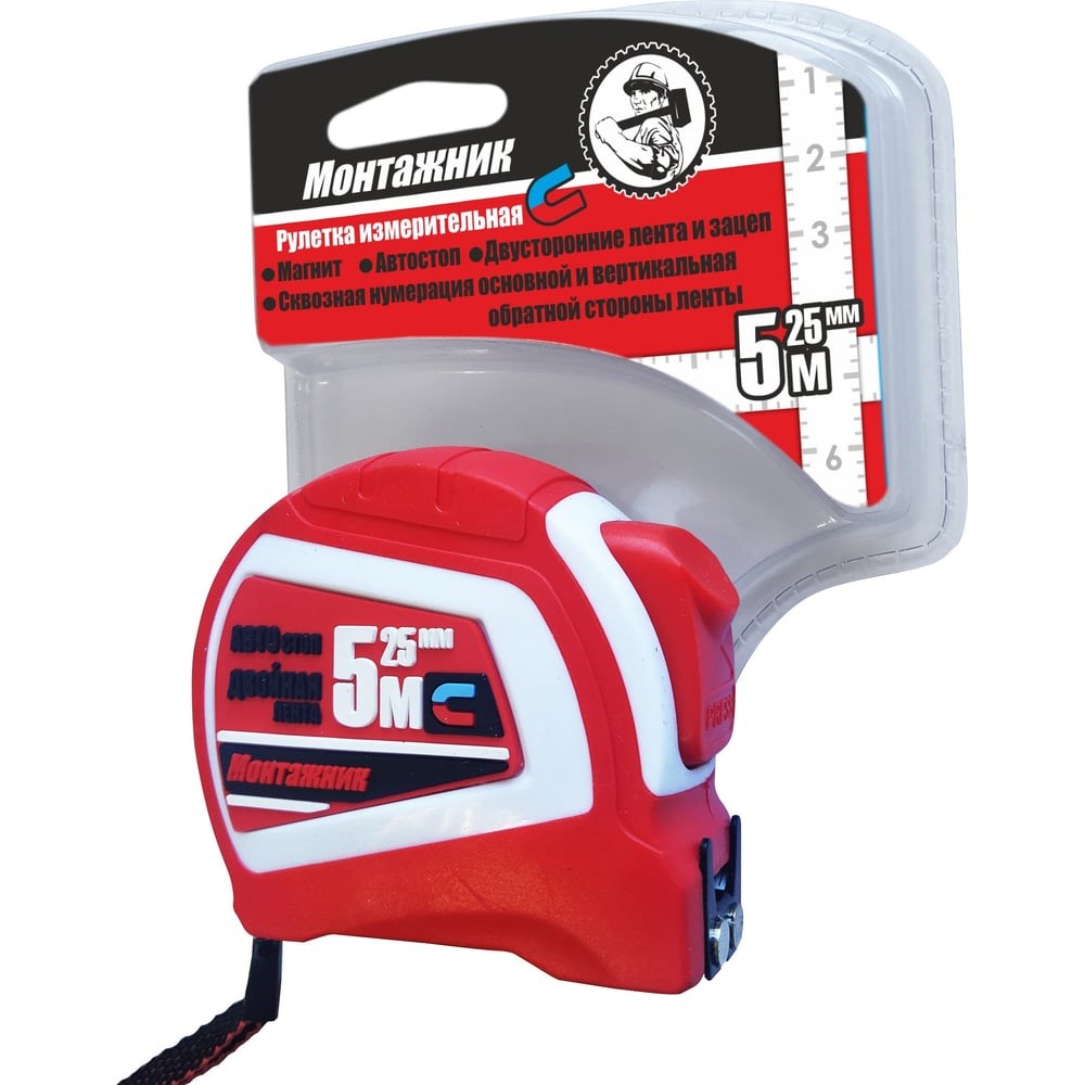 Рулетка с автостопом и магнитом Монтажник двусторонняя 5 м х 25 мм 603525 представляет собой удобный инструмент для работы в любой плоскости. Благодаря использованию двустороннего захвата и наличию разметки с обеих сторон. Удобный корпус хорошо ложится в ладонь и не скользит. Это ускоряет процесс измерений.