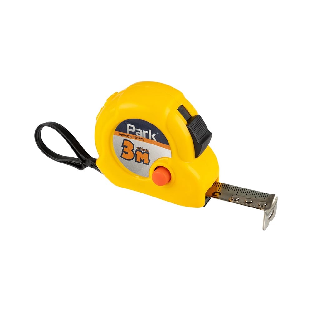 Рулетка PARK с фиксатором, пластиковый корпус, 3 м, 16 мм 103772 предназначена для измерения длины, расстояний, размеров в процессе выполнения различных работ. Прочная металлическая лента отличается стойкостью на излом и не выгорает со временем. Эргономичный пластиковый корпус обеспечивает комфортное использование. Надежный фиксатор и кнопка быстрого сматывания полотна облегчает эксплуатацию.