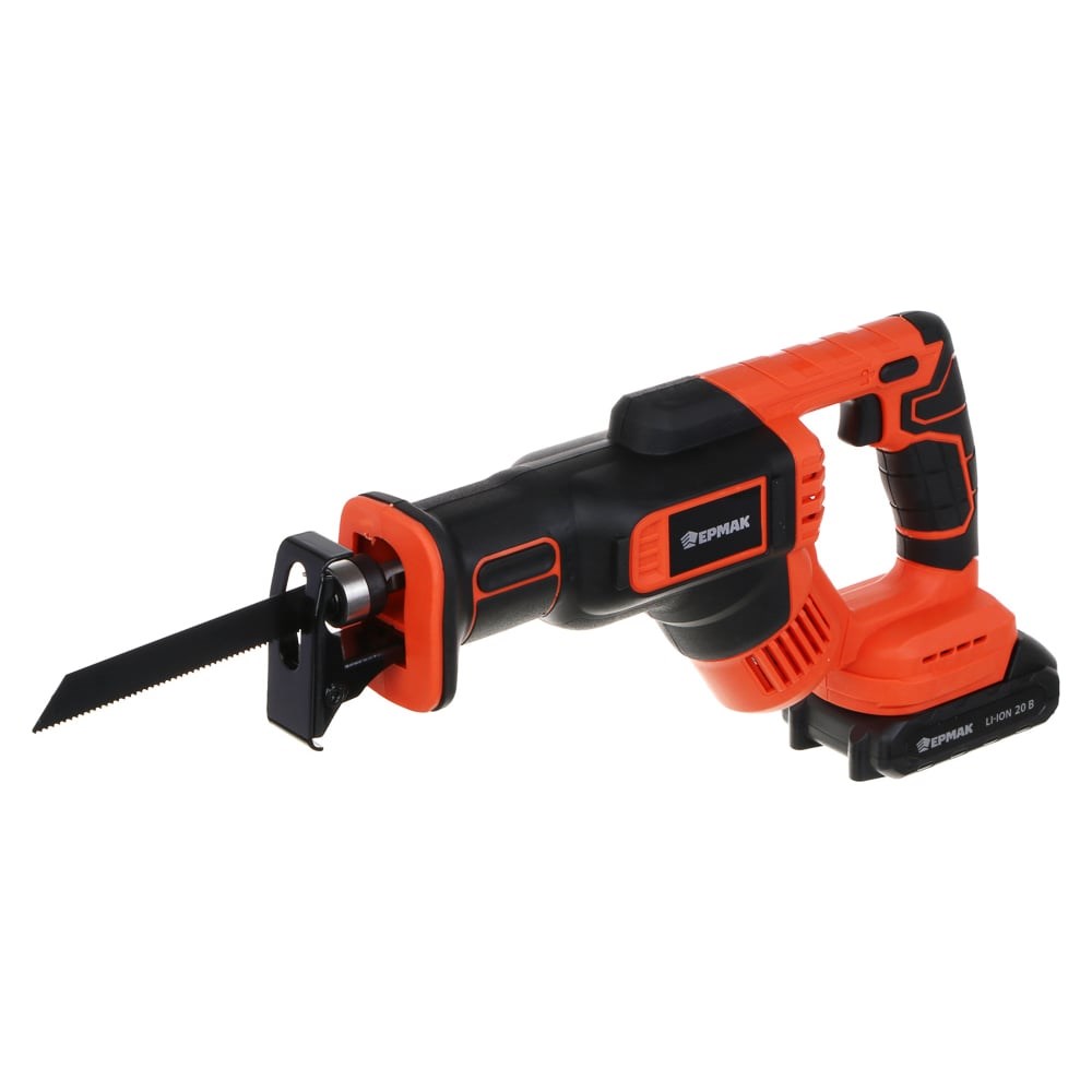 Сабельная аккумуляторная пила ЕРМАК 20 В мощностью 850 Вт – идеальное решение для обрезки веток деревьев, а также для резки труб, металлических, пластиковых и других изделий. Прекрасно подходит для работы в узких и тесных пространствах, где не справится другой инструмент. Скорость работы до 3000 об./мин. Ход пилки – 20 мм. Максимальная глубина реза дерева – 150 мм, металла – 6 мм. Работает от аккумулятора емкостью 2А*ч. Комплект включает 4 насадки. Инструмент надежный, имеет удобную форму, комфортную рукоять с антискользящим покрытием и невысокий вес.