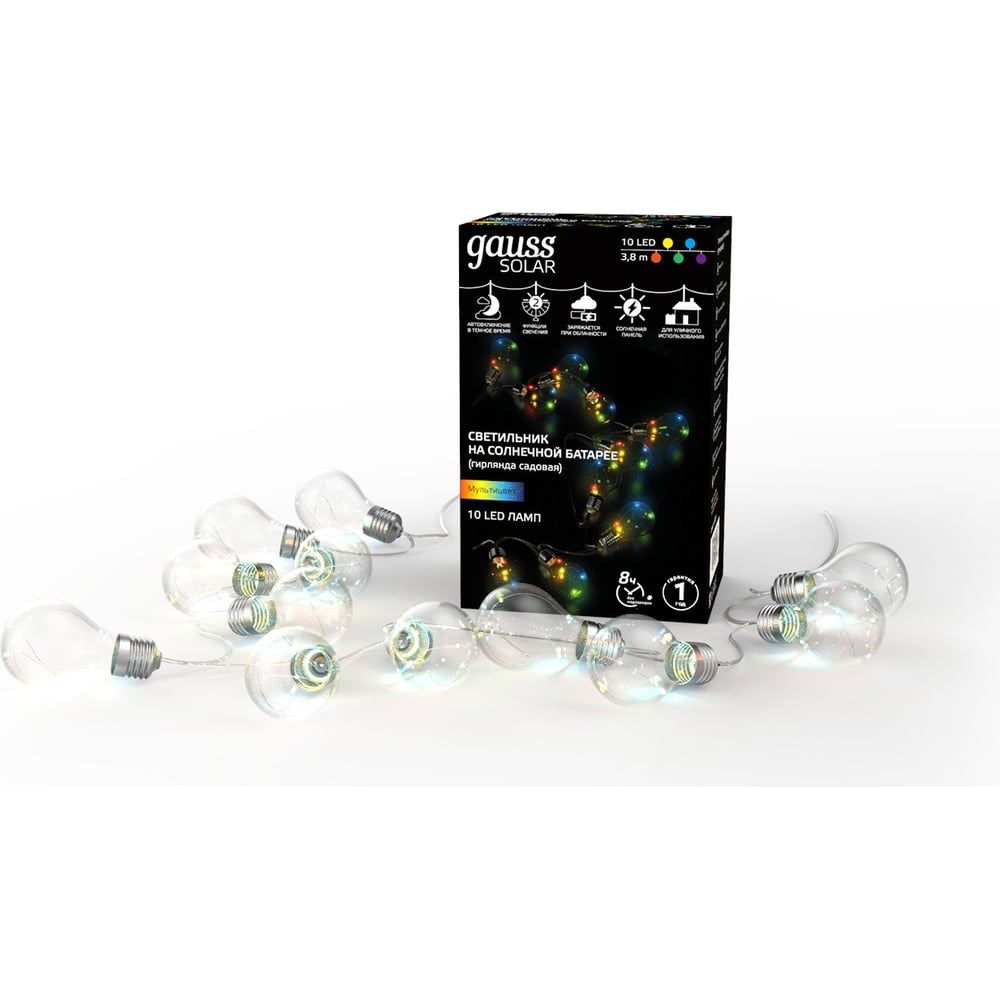 Садовая гирлянда на солнечной батарее GAUSS Solar, 10 LED ламп, большие шары, мультицвет GS035 – это классическое декоративное освещение для дачных участков, открытых парковых территорий, садов и украшение дома. Подойдет для подсветки между деревьями или фасада дома.Для подключения сеть не требуется, так как гирлянда работает на солнечной батарее.За счет степени пылевлагозащиты IP44 садовая гирлянда будет работать во время дождя.Время работы - 6-10 часов.Время заряда - 6-8 часов.