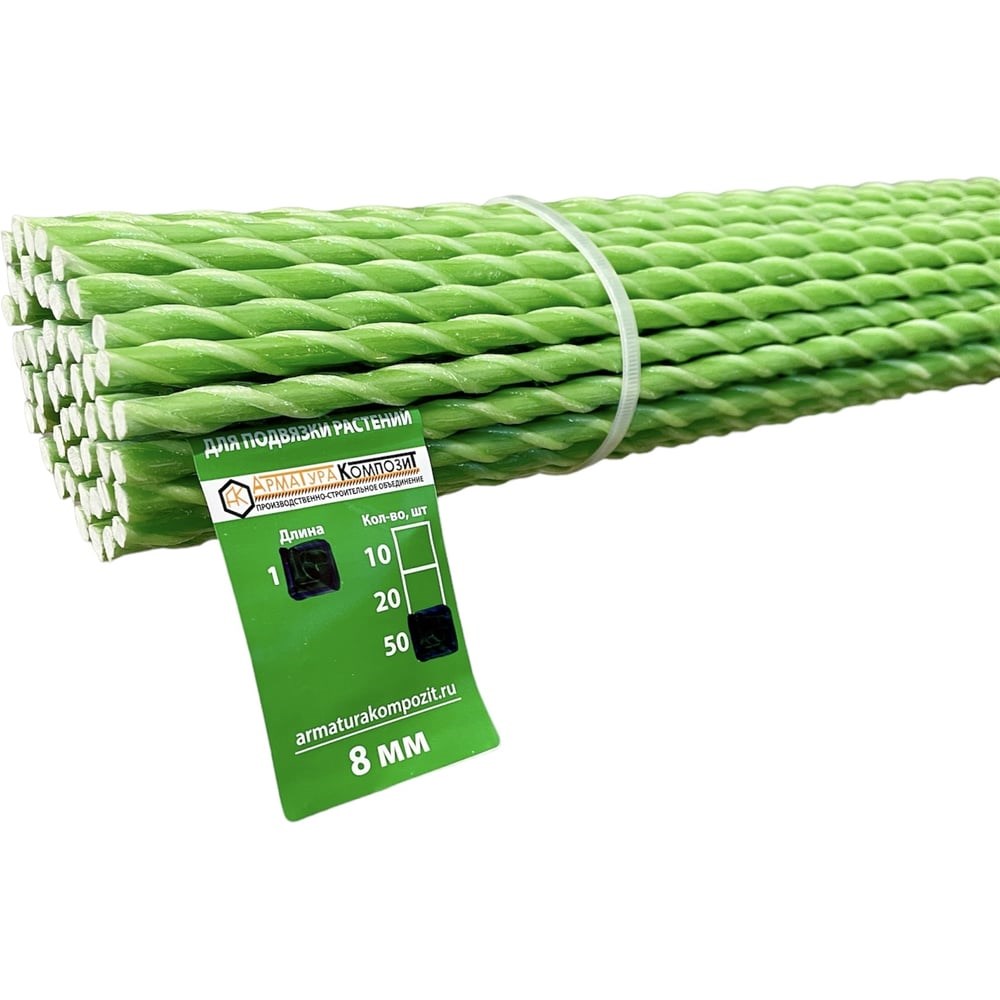 Набор колышков из стеклопластиковой арматуры, диаметр по навивке с двух сторон 8 мм, 50 шт. по 1,2 м для подвязки садовых и комнатных растений и цветов.Опора для растений в саду, защищает стебли растений от поломки при сильном ветре или от тяжести плодовС их помощью укрепляют травянистые виды культур, у которых образуются крупные цветки и плоды. Согласно правилам комфортного роста и развития растений на каждый саженец или выращиваемый кустик устанавливают индивидуальный колышек.Чтобы правильно привязать саженец любой культуры, нужно использовать веревку либо канатик. Ею привязывают главный стебель к колышку, концы скрещивают либо завязывают восьмеркой.Рекомендуем работать в перчатках.