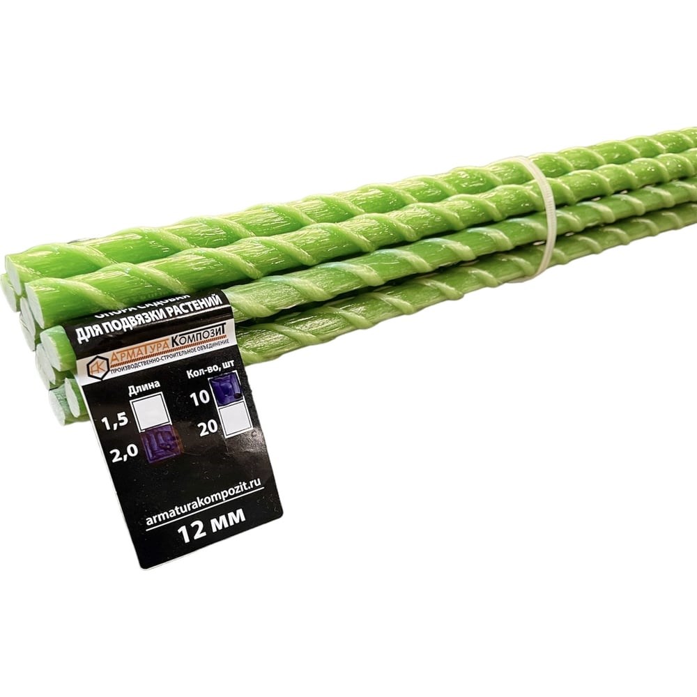 Садовая стеклопластиковая опора для подвязки растений Арматура Композит 12 мм, 10 шт., длина 2 м 4660228920526 защищает стебли растений от поломки при сильном ветре или от тяжести плодов. Внешний диаметр с учетом овивки с двух сторон 12 мм. С их помощью укрепляют травянистые виды культур, у которых образуются крупные цветки и плоды. Согласно правилам комфортного роста и развития растений на каждый саженец или выращиваемый кустик устанавливают индивидуальный колышек. Чтобы правильно привязать саженец любой культуры, нужно использовать веревку либо канатик. Ею привязывают главный стебель к колышку, концы скрещивают либо завязывают восьмеркой.