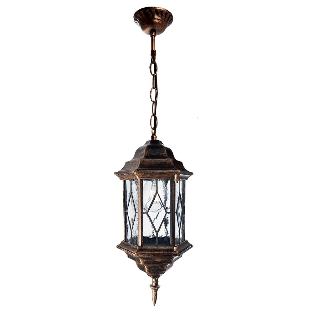 Садово-парковый светильник, шестигранный на цепочке 60W E27 230V, черное золото Feron PL125 11347 широко применяется в качестве декоративного осветительного прибора для подвесной установки и украшения террас, веранд, беседок, шатров и пр. Изделие имеет пылевлагостойкий корпус, не поддается появлению коррозии, не зависит от больших перепадов температур окружающей среды.
