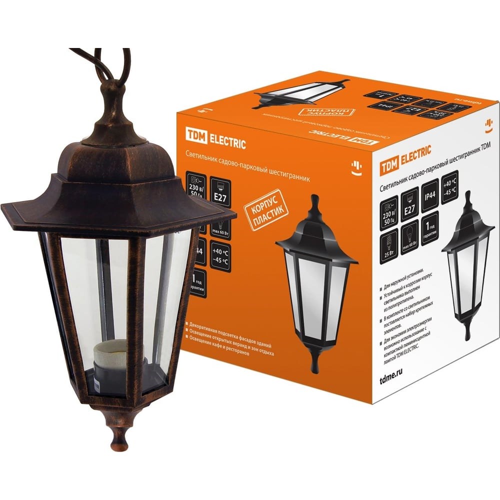 Светильник уличный потолочный садово-парковый шестигранник, подвес, пластик, медь НСУ 06-60-001 TDM Electric - это высококачественное уличное освещение, предназначенное для декоративного освещения парков, садов и других открытых пространств. Одним из основных преимуществ данного светильника является его доступная цена, которая значительно ниже, чем у аналогичных светильников с корпусом из алюминиевого сплава. Светильник НСУ 06-60-001 оснащен настенным креплением, которое позволяет устанавливать его вверх или вниз плафоном в зависимости от предпочтений пользователя. Корпус светильника изготовлен из пластика, а рассеиватель - из стекла. Это обеспечивает долговечность и надежность светильника, а также его привлекательный внешний вид. Светильник имеет степень пылевлагозащиты IP44, что делает его устойчивым к воздействию влаги и пыли. Светильник работает от напряжения 220-240 В и имеет класс электробезопасности II. Светильник поставляется в индивидуальной коробке, выполненной в фирменном стиле TDM Electric. На коробку нанесена вся необходимая информация о товаре. Выбирая светильник уличный потолочный садово-парковый шестигранник, подвес, пластик, медь НСУ 06-60-001 TDM Electric, вы получаете качественное и доступное уличное освещение для вашего сада или парка.