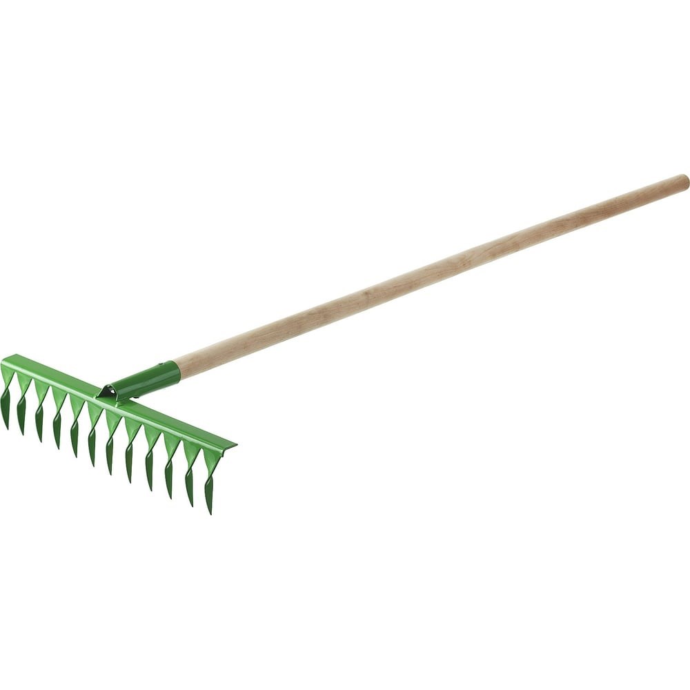 Садовые грабли с черенком РОСТОК 14 витых зубцов 421900-14 используются для выравнивания грунта, а также очистки садовых участков от различного мусора, скошенной травы и опавших листьев. Рабочая часть из прочной стали устойчива к деформации. Порошковая краска оберегает инструмент от коррозии. Широкие зубья надежно удерживают собранный мусор, позволяя убрать территорию за один проход. Деревянный черенок обеспечивает удобный хват.