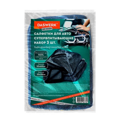Салфетки из микрофибры для авто супервпитывающие КОМПЛЕКТ 3 шт. (2 шт. – 50х60 см, 1 шт. – 20х20 см), DASWERK (ДАСВЕРК), 609486