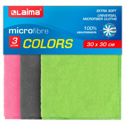Салфетки из МИКРОФИБРЫ универсальные, 30х30 см, КОМПЛЕКТ 3 шт., ассорти (розовый, зеленый, серый), 180 г/м2, LAIMA, 700054