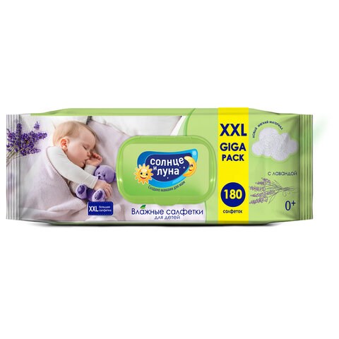Салфетки влажные детские 180 шт., СОЛНЦЕ И ЛУНА с лавандой, 0+, с пластиковым клапаном, 9920