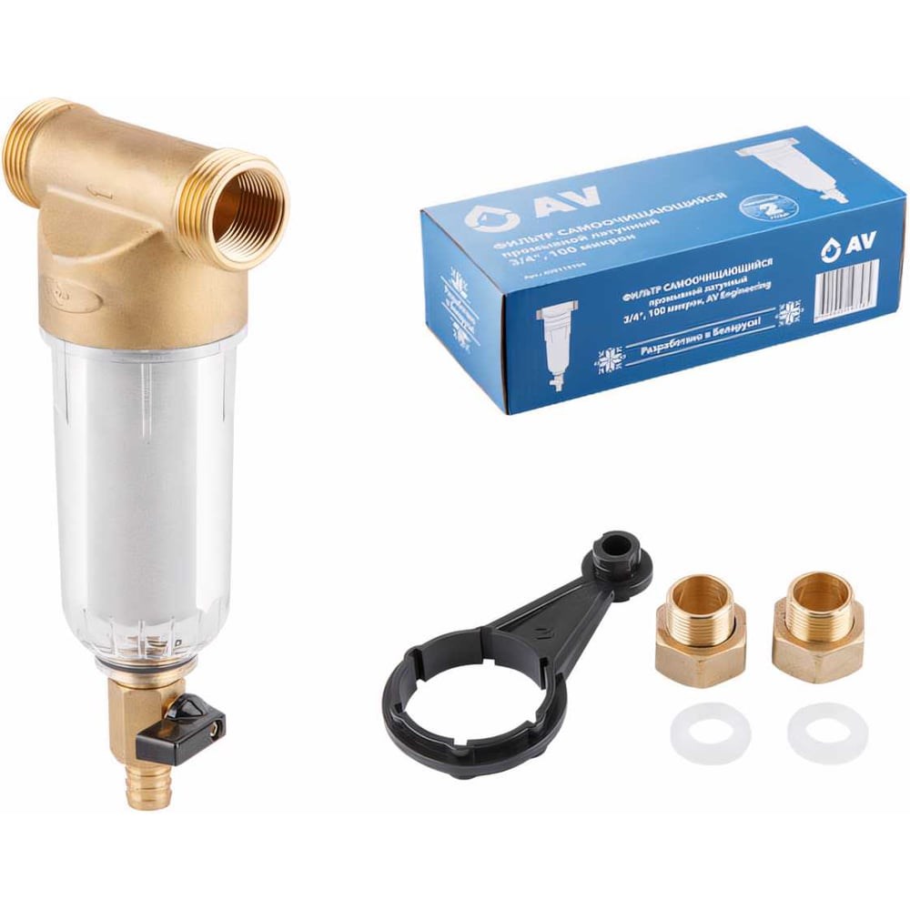 Магистральный фильтр AV Engineering самопромывной 3/4" 100 мкм AVE115704 с сеточным картриджем из нержавеющей стали, 100 микрон. Используется для холодной воды. Максимальная рабочая температура 40 °С.