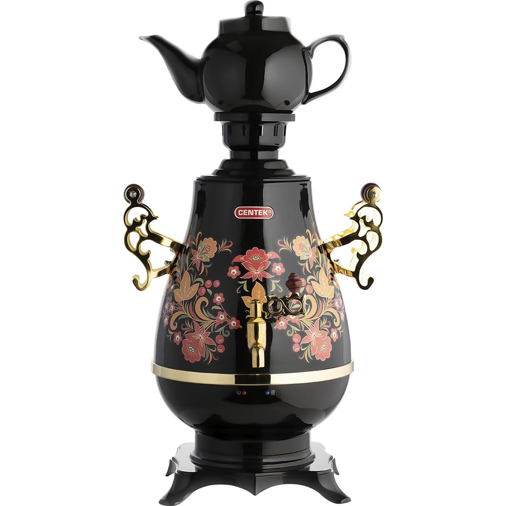 Самовар Centek черный + рисунок + золото, 4.0 л, 2100 Вт, поддержание температуры + LED индикатор, керамический заварочный чайник 1 л CT-0092 B предназначен для кипячения воды. Благодаря функции поддержания температуры вода дольше остается горячей. Имеет плотно прилегающую крышку, что обеспечивает герметичность при закипании. Самовар поставляется с керамическим заварочным чайником, который дольше сохраняет тепло.