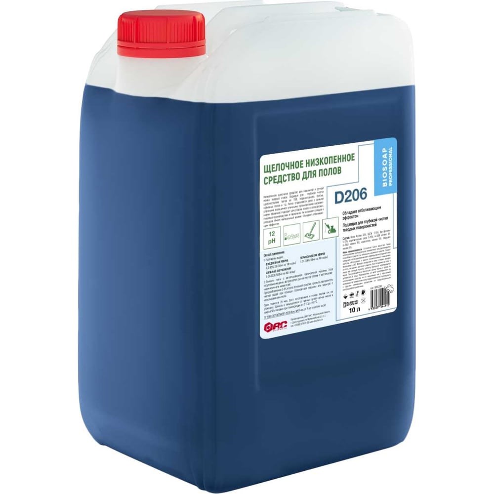 Щелочное средство для машинной и ручной мойки твердых полов АиС BIOSOAP Proffecional / D206 10л 9060399 подходит для глубокой чистки щелочестойких полов из ПВХ, керамогранита, бетона, наливных полов и т.д. Легко справляется даже с самыми сложными въевшимися уличными, органическими загрязнениями. Идеально подходит для уборки полов в автосалонах, пищевых производствах и парковках. Не оставляет следов и разводов. Имеет нейтральный аромат. Обладает отбеливающим эффектом. Применение:Разбавить водой: ЕЖЕДНЕВНАЯ УБОРКА 0,3-0,5% (30-50мл на 10л воды), ПЕРИОДИЧЕСКАЯ УБОРКА 1-2% (100-200мл на 10л воды); СИЛЬНЫЕ ЗАГРЯЗНЕНИЯ 3-5% (300-500мл на 10л воды).Вымыть полы с использованием поломоечной машины (при отсутствии машины допускается ручной метод уборки с использованием моечного инвентаря). При разбавлении 3-5%, после основной очистки, промыть поверхность чистой водой при помощи поломоечной машины или вручную с использованием мопа.