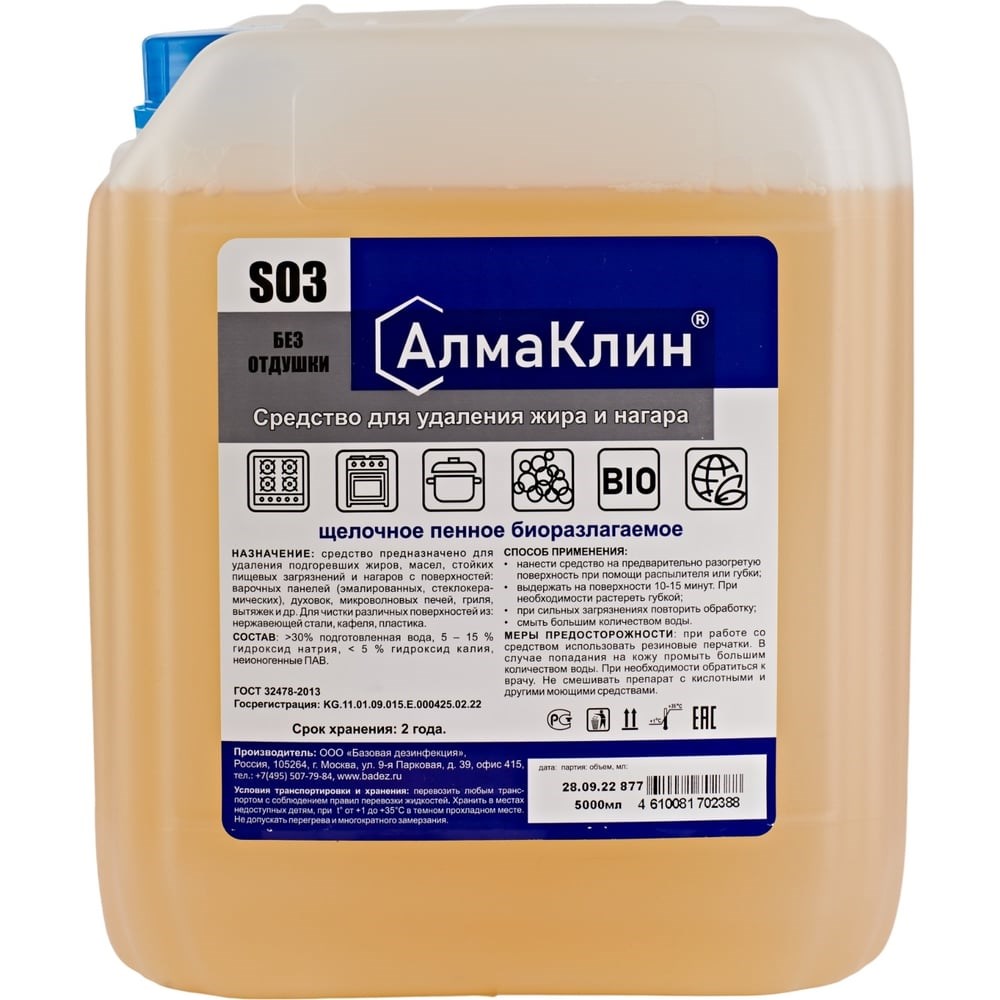 Щелочное моющее средство для мойки грилей и духовок ООО "БАЗОВАЯ ДЕЗИНФЕКЦИЯ" АлмаКлин S03, готовое к применению, 5 л, евро канистра S03-5Л предназначено для удаления подгоревших жиров, масел, стойких пищевых загрязнений с поверхностей стеклокерамических плит, духовок, гриля, вытяжек, нержавеющей стали, кафеля, пластика. Не содержит хлора, фосфатов, красителей. Средство эффективно и быстро удаляет пригоревшие остатки пищи, въевшийся жир и грязь.