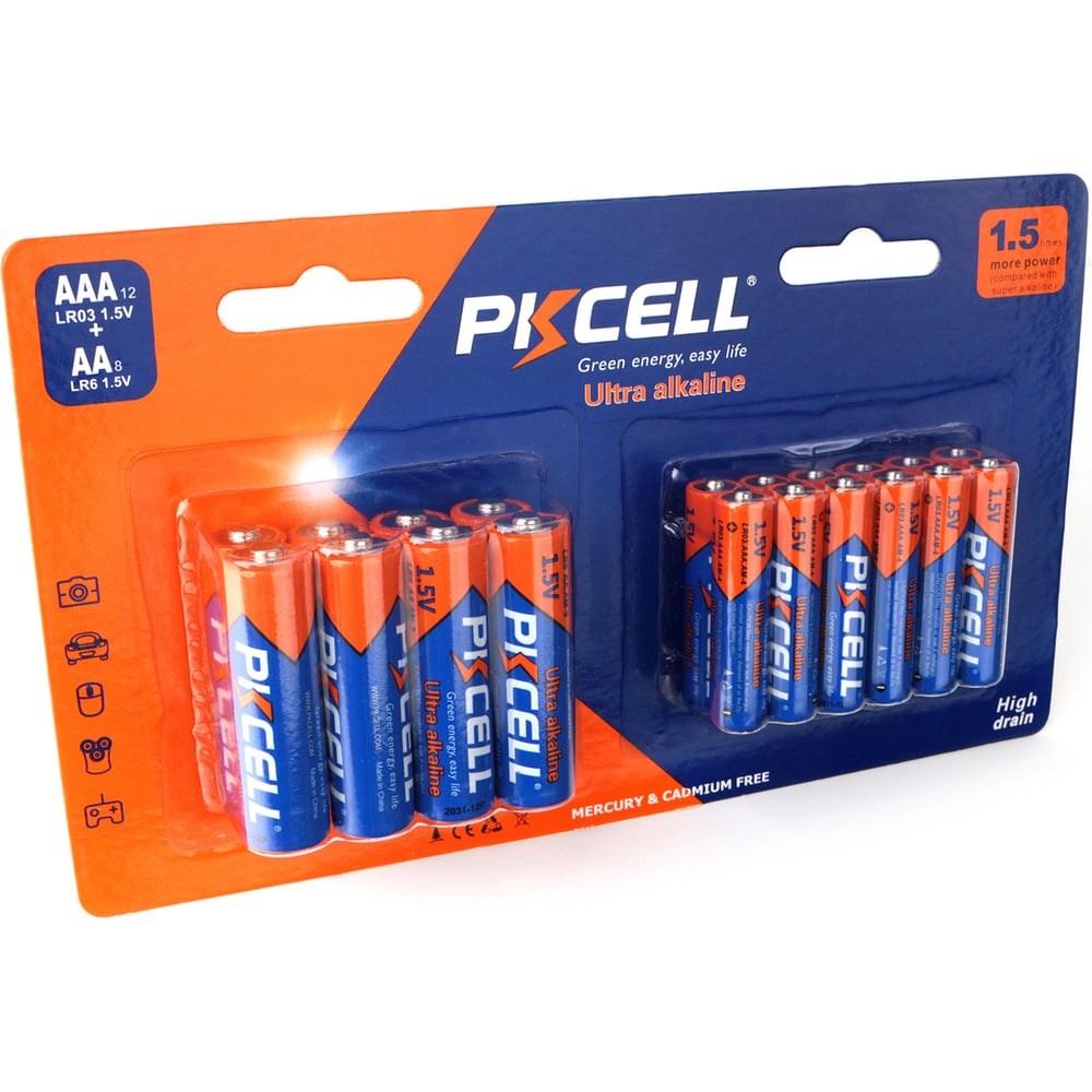 Щелочной/алкалиновый элемент питания PKCELL тип - AAА 12 шт + АА 8 шт в блистере LR0312+LR68 рекомендуется использовать в устройствах со средним и высоким потреблением энергии (плееры, диктофоны, электробритвы, компьютерные мыши, весы, фотоаппараты, фотовспышки, фонари, радиостанции и прочее). Не содержит ртуть и кадмий.