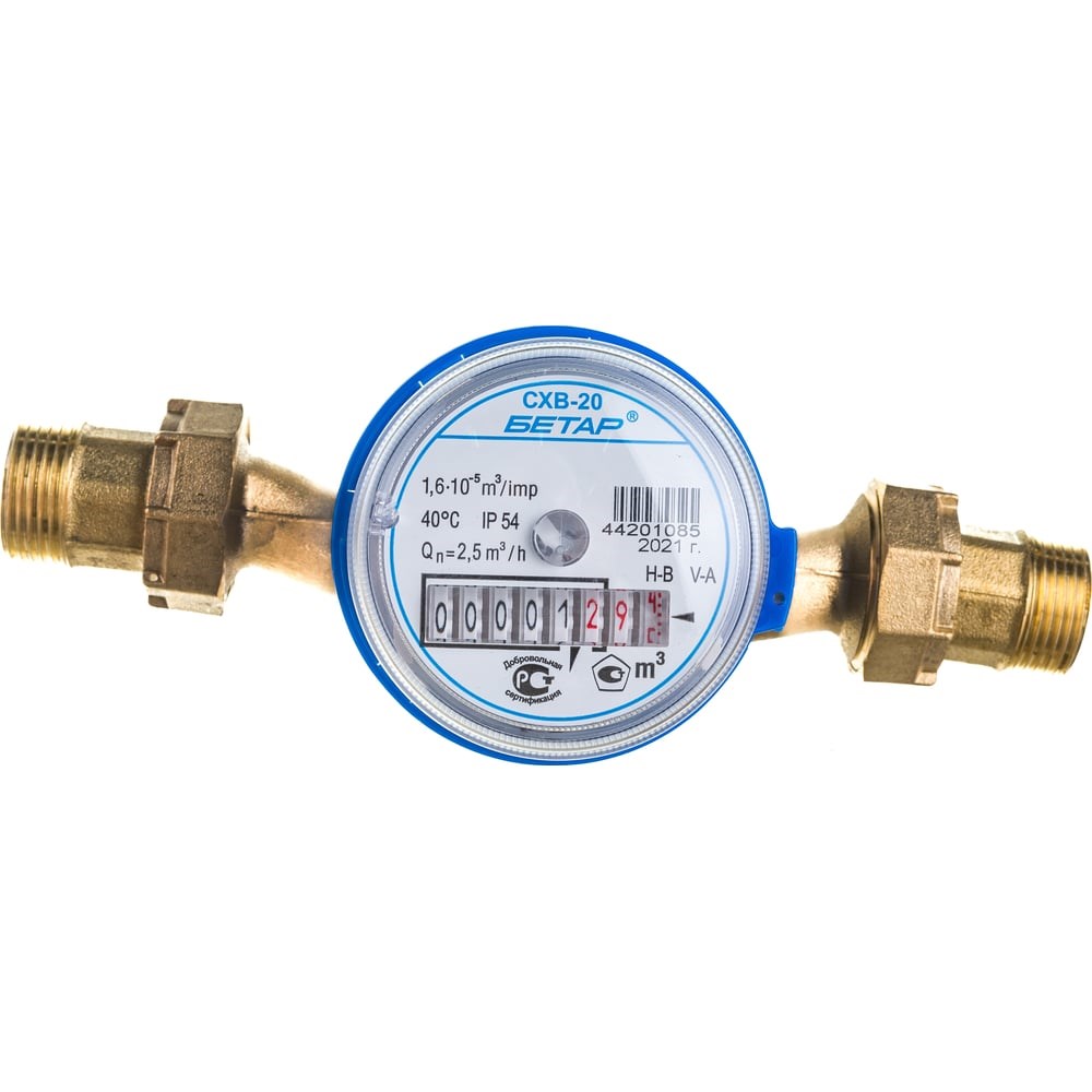 Счетчик холодной воды Бетар с КМЧ СХВ-20 Бет.Х-20 предназначен для измерения объема холодной и горячей питьевой воды, протекающей по трубопроводу при температуре от плюс 5°C до плюс 40 °С для счетчиков холодной воды (СХВ) и от плюс 5°C до плюс 90 °С для счетчиков горячей воды (СГВ) при давлении не более 1,0 МПа (10 кгс/см2). Монтаж водосчетчика в систему ХВС может осуществляться в вертикальном или горизонтальном положении. По этой причине не составит большого труда установить прибор даже в небольшом помещении. Расходомер Бетар СХВ 20 имеет следующие основные параметры: Материал корпуса: латунь и пластик. Диаметр: 20 мм. Монтажная длина: 190 мм (без сгонов 130 мм). Межповерочный интервал: 6 лет. Расход: минимальный – 0,1 м3/ч; максимальный – 5 м3/ч. Антимагнитная защита: есть. Принцип работы водосчётчика следующий: Вода направляется в измерительную камеру и оказывает механическое воздействие на крыльчатку. Крыльчатка крутится и через редуктор вращение передаётся счётному механизму. Прибор учёта Бетар СХВ 20 имеет высокий класс точности, поэтому даже незначительное движение жидкости фиксируется измерительным устройством. Снятие показаний и поверка Самостоятельно можно осуществлять только снятие показаний. Для того чтобы правильно осуществить оплату за холодную воду необходимо учитывать только цифры, расположенные в чёрных квадратиках (красные показывают литры).