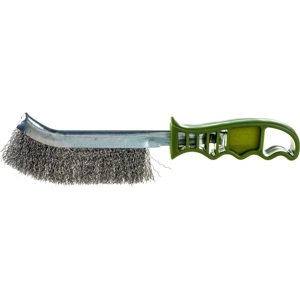 Щётка с пластиковой рукояткой, стальная щетина Дело Техники 270211 подойдет для удаления загрязнений с металлических поверхностей. Инструмент справится с: ржавчиной; краской; любыми твердыми отложениями. Толщина щетины: 0.3 мм.