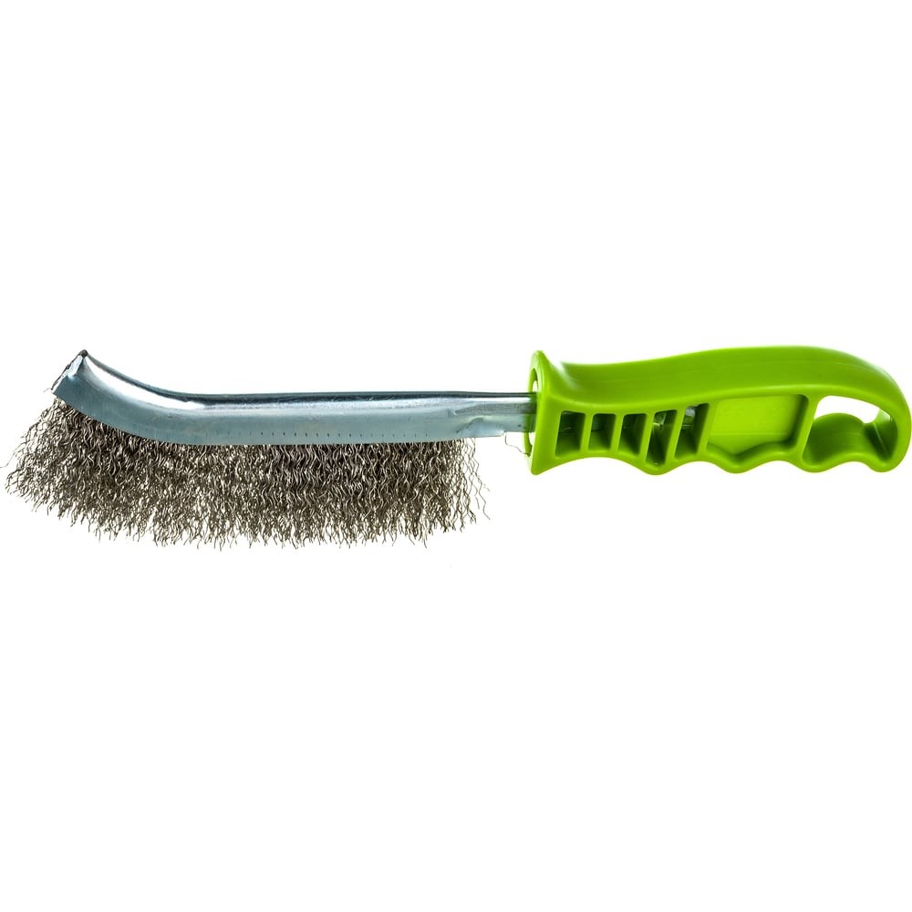 Щётка с пластиковой рукояткой, щетина из нержавеющей стали Дело Техники 270251 подойдет для удаления загрязнений с металлических поверхностей. Инструмент справится с: ржавчиной; краской; любыми твердыми отложениями. Толщина щетины: 0.3 мм.