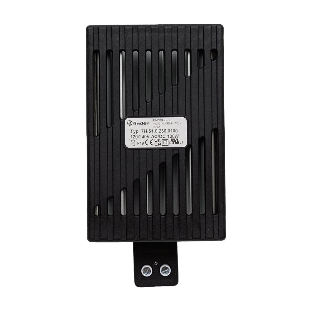 Дополнительные характеристики щитового нагревателя Finder питание 110-250в ас/Dc, мощность тепловая 100вт 7H5102300100: Безопасное прикосновение. Клипса для монтажа на рейке 35 мм (EN 60715). Нагревательный элемент - саморегулирующийся нагревательный элемент PTC. Защитный корпус - пластик в соответствии с UL94 — V0, черный. Радиатор - алюминиевый профиль. Электрическое соединение - винтовые клеммы. Монтажное положение - вертикальное.