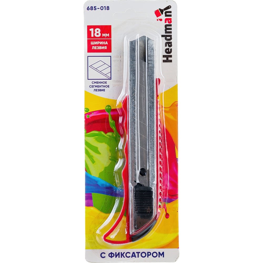 Сегментный нож с фиксатором HEADMAN толщина лезвия 0,4мм, ширина 18мм, пластик, металл 685-018 подойдет для резки плотных напольных покрытий и других аналогичных материалов. Конструкция включает в себя стальные направляющие. Рельефный корпус обеспечивает надежное удержание ножа в процессе эксплуатации.