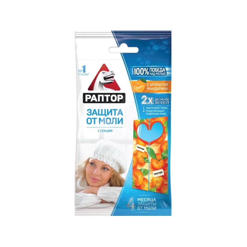 Секция от моли с запахом мандарина РАПТОР, картонная подвеска, 2 шт., NEW 2019, 25/100 ST1011 защищает от бабочек моли, ее личинок и кладки яиц. Подходит для хранения меховых и шерстяных изделий. Средство не оставляет пятен и следов на одежде, имеет приятный аромат мандарина. Эффективно действует на протяжении 4-х месяцев. Выпускается в удобной форме с пластиковой подвеской.