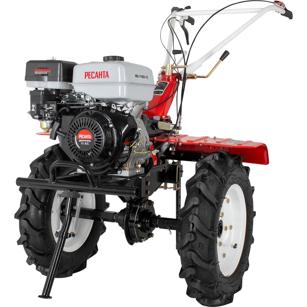 МБ-11000P-12 Ресанта— это представитель линейки многофункциональных сельскохозяйственных машин для обработки земли тяжелого класса. Машины этой категории предназначены для выполнения большого объема культивационных мероприятий на обширных посевных площадях в режиме непрерывной работы. Высокие технические характеристики мотоблока и его универсальность обеспечиваются мощной силовой установкой.Энергию движения обеспечивает одноцилиндровый 4-х тактный ДВС. Бензиновый двигатель, при потреблении топлива 0,375 гр* кВт/ч выработанной энергии, развивает мощность 11 л.с. Для заправки агрегата применяется высокооктановый бензин не ниже 92. Топливный бак смонтирован непосредственно на двигателе и имеет емкость – 3,6 л.Двигатель имеет блокирующую защиту от работы с низким уровнем масла. Обогащение топливной смеси поступающей в камеру сгорания производится через маслонаполненный воздушный фильтр.Шестеренчатый редуктор в масляной ванне и чугунном корпусе, обеспечивает передачу крутящего момента от силовой установки мотоблока на рабочий инструмент или на активное навесное оборудование. Навеска может устанавливаться на шестигранную рабочую ось редуктора, сечением 32 мм, или подключаться к ВОМ диаметром 18 мм. Редуктор предполагает три режима работы агрегата: 2 передачи вперед, и 1 назад.Органы управления работой МБ-11000P-12 Ресанта выведены на рулевые дуги и позволяют оператору оперативно менять или регулировать режим подачи агрегата во время работы.