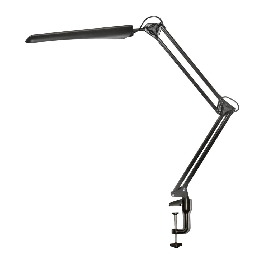 Светодиодный светильник на металлической струбцине Гермес черного цвета. Выключатель сенсорный на плафоне. Функция регулировки яркости света. Подходит для использования в жилых помещениях и учебных заведениях, в офисах.