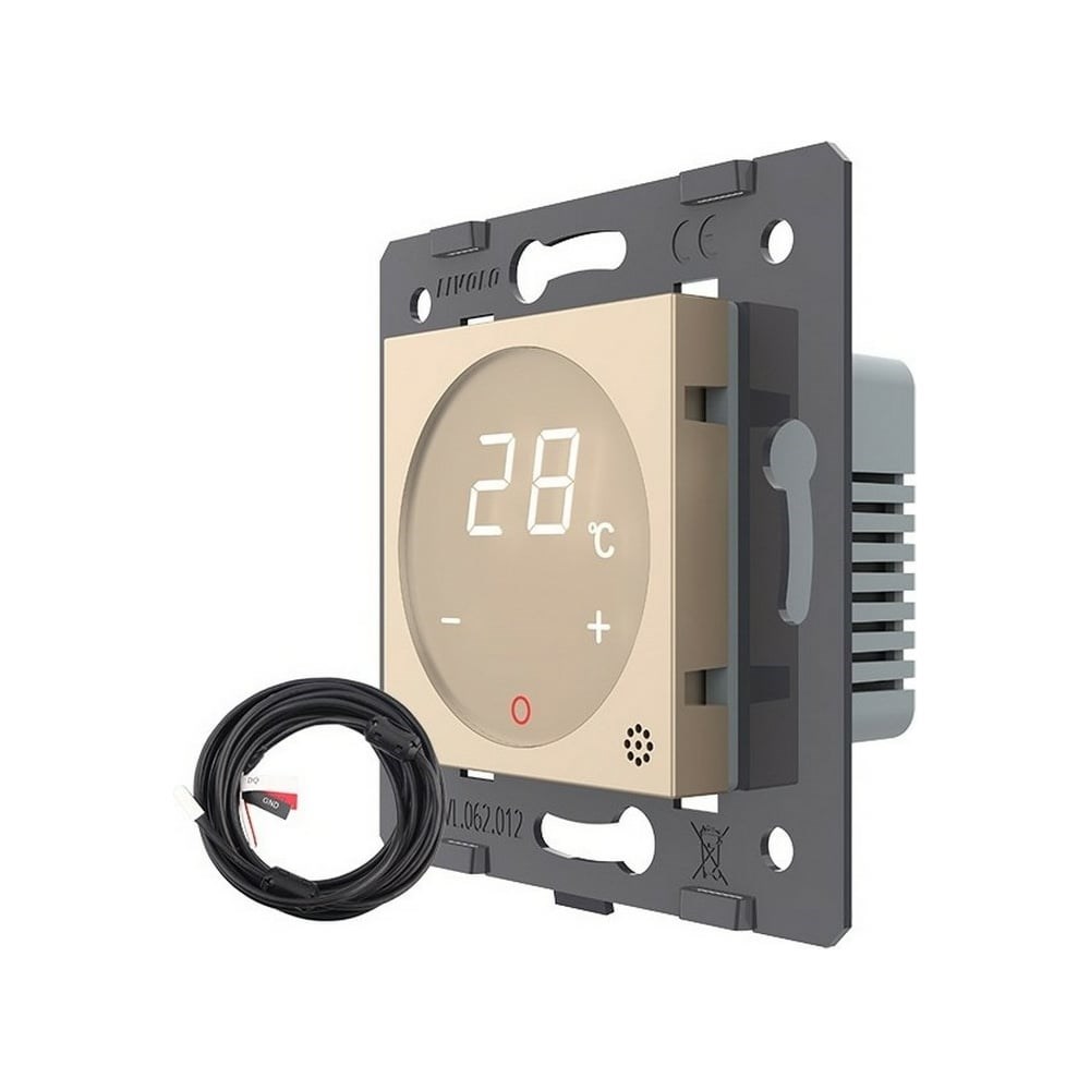 Сенсорный терморегулятор пола LIVOLO с внешним датчиком, золотой (механизм) VL-FCQ1-2APS72 идеально вписывается в любую комнату, дополняя дизайн интерьера. Цифровая индикация температуры делает настройку наглядной и точной. Терморегулятор имеет встроенный датчик температуры воздуха, а в комплект дополнительно входит внешний датчик температуры пола длиной 5 метров модель VL-XQ001. При подключении внешнего датчика пола, встроенный датчик температуры воздуха отключается. Эксплуатация В выключенном состоянии кнопка вкл/выкл горит синим цветом. При включении терморегулятора кнопка вкл/выкл горит красным цветом, отображаются кнопки «+» и «-» регулировки температуры и текущая температура, переданная датчиком. При касании кнопки «+» или «-» регулировки температуры показывается заданная температура. При каждом коротком нажатии на кнопку установка температуры изменяется на 1 градус. При нажатии в течение 3 секунд установка температуры изменяется с шагом 2 градуса. Диапазон установки температуры от 5 до 35 градусов. Терморегулятор поддерживает установку и измерение температуры в градусах Цельсия и Фаренгейта. Для переключения между системами измерения, необходимо одновременно нажать и удерживать кнопки «+» и «-» более 3 секунд. Если кнопки регулировки температуры не нажимать в течение 5 секунд, на дисплее будет отображаться температура, измеренная датчиком. При отключении питания терморегулятора настройки сохраняются. Рамка в комплект не входит.