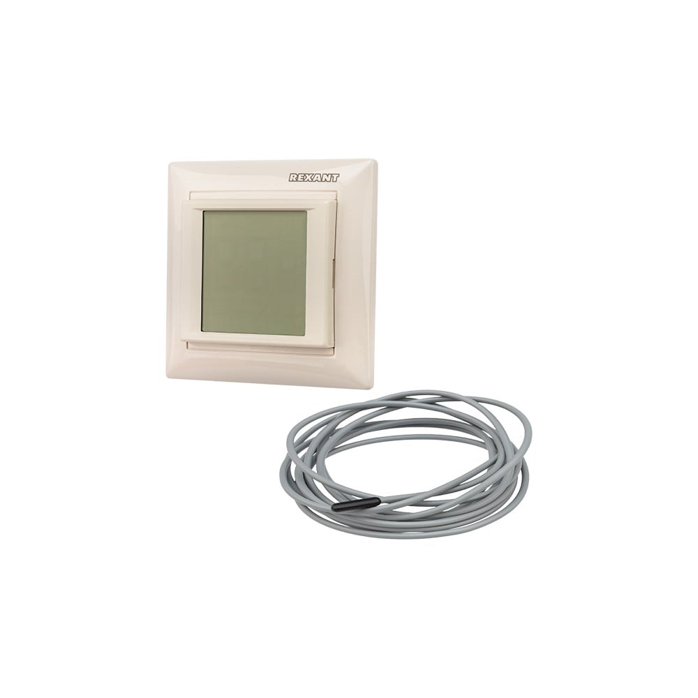 Терморегулятор REXANT сенсорный RX-419B бежевый 51-0585 в корпусе бежевого цвета с диапазоном регулировок +5...+45 °C, коммутируемым током контактов 16 A, внешним датчиком температуры 10 кОм. Совместим с Legrand серии Valena. Характеристики: Номинальное напряжение: 220 В. Диапазон регулируемых температур: +15...+45 °C. Установка температуры по диапазону: с шагом 0.5 °С. Степень защиты: IP52. Максимальная мощность: 3500 Вт. Количество режимов программирования: 4 Часы реального времени: есть Блокировка экрана: есть Длина установочного провода: 2,5 м. Функция коррекции термодатчика: есть. Режим антизаморозки: есть. Диапазон коррекции термодатчика: –9,5...+9,5 °С. Задание пароля на изменение параметров: есть. Датчик температуры: внешний. Диагональ дисплея: 60 мм.