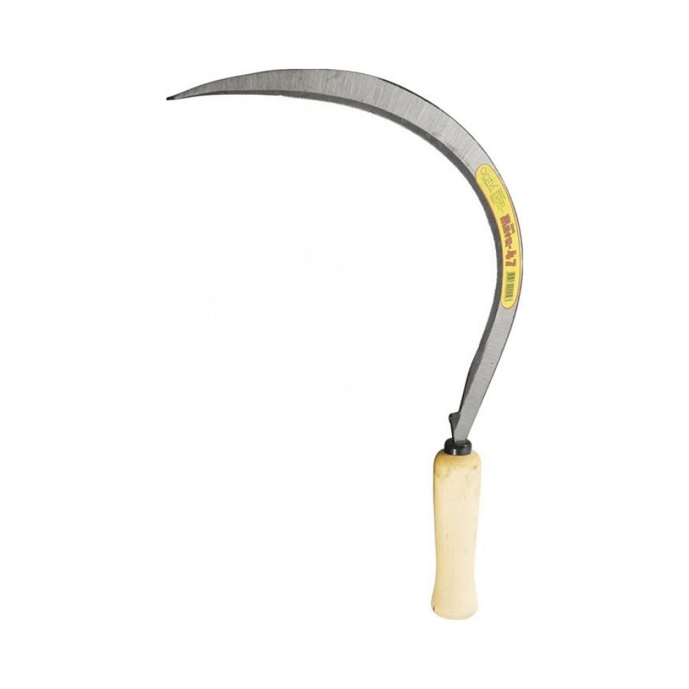 Серп ЛЕТО Жнец 47 53 с зубцом используется для уборки зерновых культур или заготовки полевых трав. Легко срезает даже толстые стебли травы. Имеет эргономичную рукоятку из дерева.