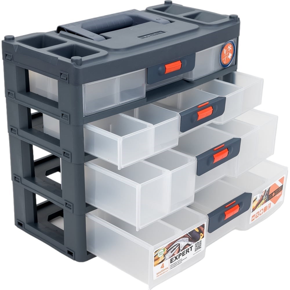 Органайзер вертикальный помогает содержать в порядке, переносить на место выполнения работ и быстро находить метизы и аксессуары. Идеален для использования дома, на даче, в гараже, мастерской, в автомобиле. Секции снабжены замками, предотвращающими случайное открытие. Внутреннее деление секций на отсеки делает удобным размещение внутри органайзера деталей, которые необходимо отделить друг от друга. Съёмные перегородки позволяют изменять размер отсеков под личные нужды. Прозрачная передняя часть секций позволяет увидеть их содержимое в закрытом состоянии. В крышке имеются выемки для временного хранения мелких деталей. Подходит для хранения рыболовных и швейных принадлежностей, коллекционирования, занятия хобби.