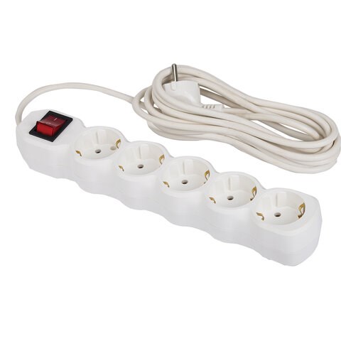 Длина провода – 5 м. Защита от скачков напряжения. Провод ПВС с сечением 3х0,75 мм2. Кнопка включения. Заземление. Максимальная нагрузка – 2200 Вт. Сила тока – 10 А. Материал – негорючий, ударопрочный РР-пластик. Цвет – белый.
