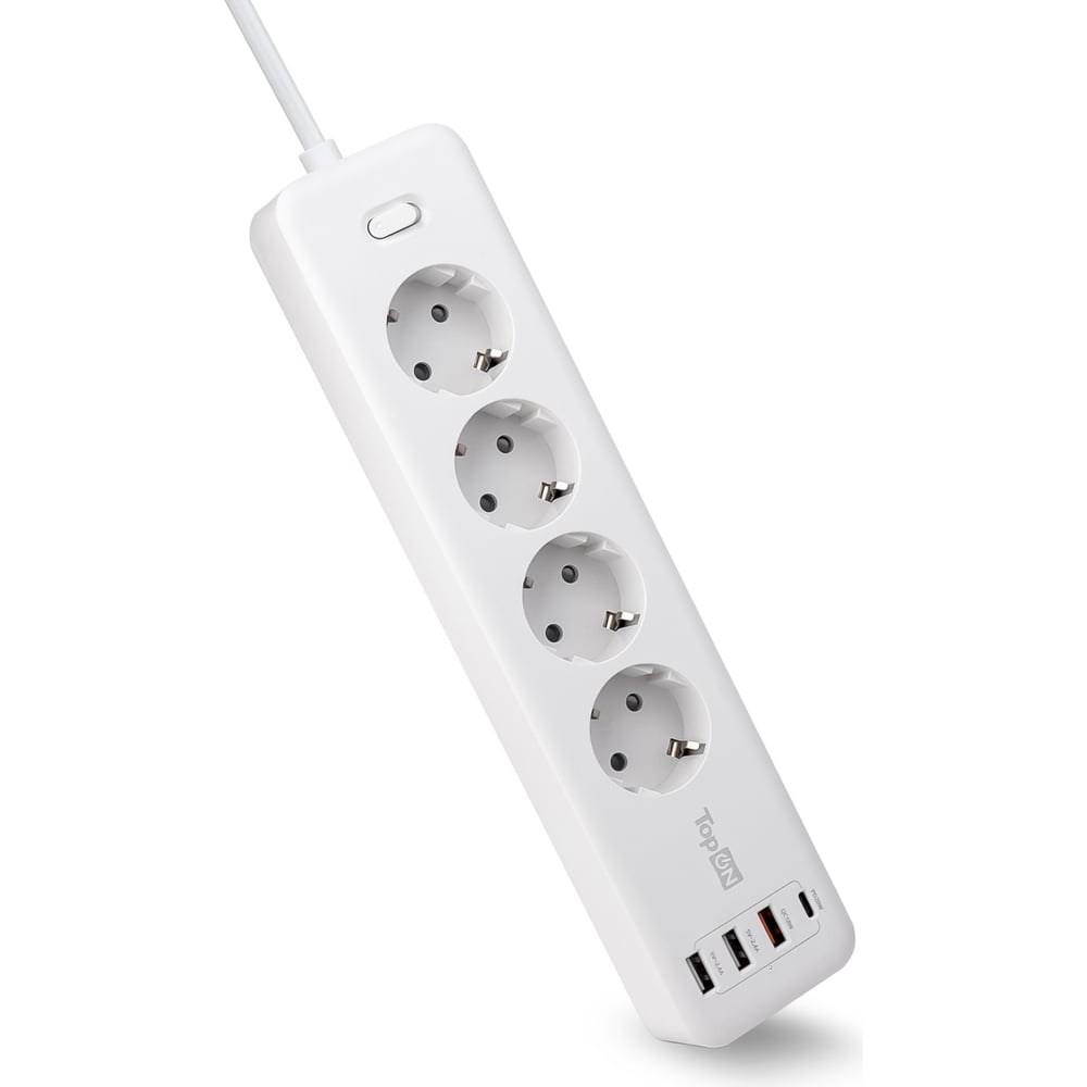 Сетевой фильтр TopOn TOP-PWS4 4 розетки, 3 USB, Type-C, PD 20W QC3.0, 4000W, 3м Белый TOP-PWS4-3 предназначен для организации пространства дома, в офисе, гараже или мастерской. 16А 250В~50/60Гц 4000 Вт MAX USB Type-C: 5V~3A, 9V~2.22A, 12V~1.67A PD 20 Вт USB-A1: 5V~3A, 9V~2A, 12V~1.5A QC3.0 18 Вт USB-A2/A3: 5В~2.4А 12 Вт TOP-PWS4 имеет 4 розетки, 3 USB порта и USB Type-C, благодаря чему можно одновременно подключить 8 электрических устройств, расположив их в удобном месте. Кабель из утолщенной медной жилы рассчитан на нагрузку 4000W/16A Усиление кабеля в месте крепления к корпусу Износостойкая и огнеупорная оболочка Стяжка на липучке для удобного хранения кабеля