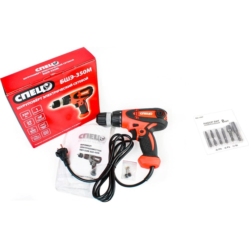 Сетевой шуруповерт Спец БШЭ-350M 220В, 350Вт, 0-800об/мин, 25Нм, диаметр патрона 10мм, реверс + Набор бит универсальный 8шт СПЕЦ-3328/4107