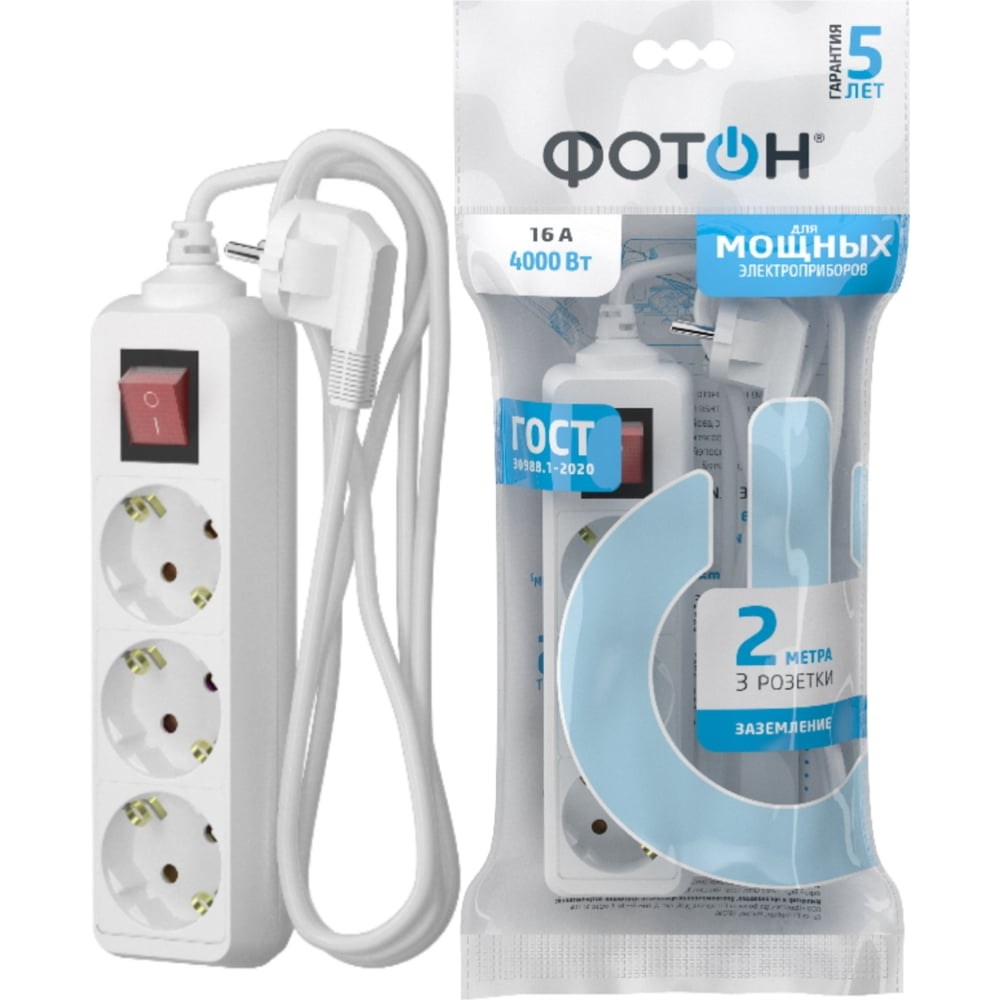 Удлинители C ЗАЗЕМЛЕНИЕМ рассчитаны на одновременное подключение приборов суммарной мощностью до 4000 Вт (номинальный ток - 16А). Они снабжены защитными шторками, прикрывающими контакты, для обеспечения дополнительной безопасности. Провод 3х1,0мм (квадратных) - сечение проводника 1,0 мм (квадратных). Латунная контактная группа обеспечивает высокую электропроводность и максимально плотный контакт со штырями вилки подключаемых приборов. Корпус изготовлен из термоустойчивого и ударопрочного ABS-пластика. Все удлинители ФОТОН предназначены для подключения к розеткам европейского стандарта. * Отсутствие искрения* Электро- пожаробезопасность Защитный бортик высотой 12 мм исключает риски поражения электрическим током при случайном попадании пальца в зазор между вилкой и гнездовым разъемом. Вся продукция полностью соответствуют нормам российского ГОСТ и EAC.