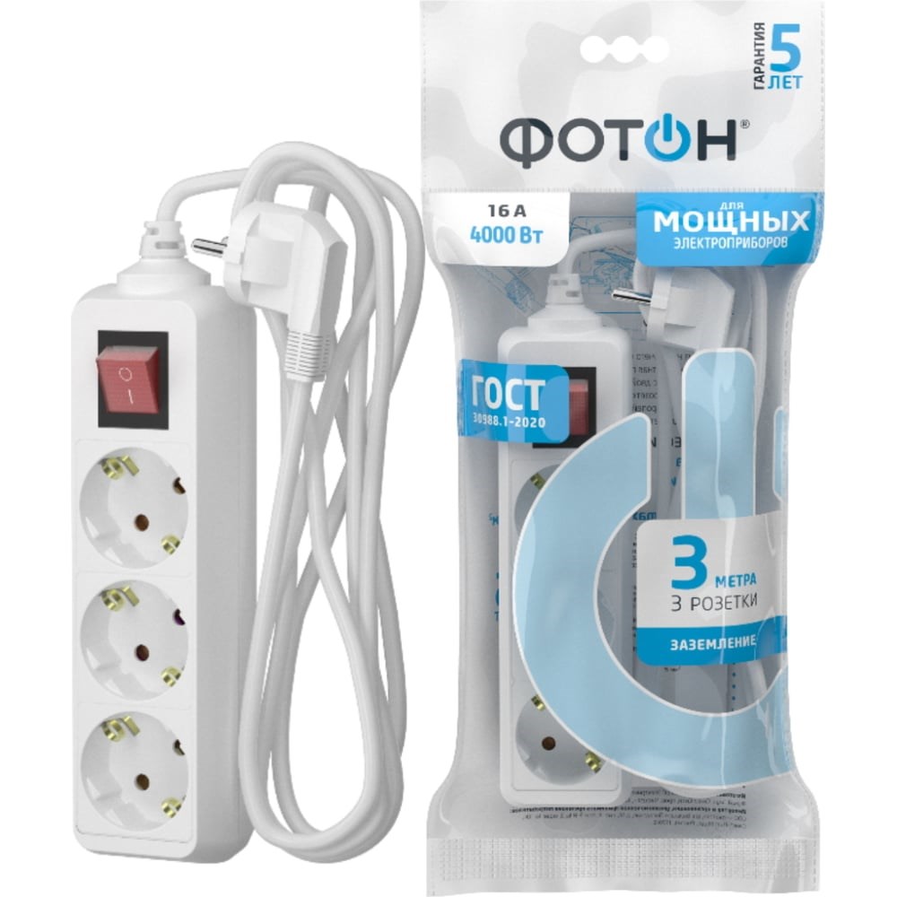 Удлинители C ЗАЗЕМЛЕНИЕМ рассчитаны на одновременное подключение приборов суммарной мощностью до 4000 Вт (номинальный ток - 16А). Они снабжены защитными шторками, прикрывающими контакты, для обеспечения дополнительной безопасности. Провод 3х1,0мм (квадратных) - сечение проводника 1,0 мм (квадратных).Латунная контактная группа обеспечивает высокую электропроводность и максимально плотный контакт со штырями вилки подключаемых приборов. Корпус изготовлен из термоустойчивого и ударопрочного ABS-пластика. Все удлинители ФОТОН предназначены для подключения к розеткам европейского стандарта.* Отсутствие искрения* Электро- пожаробезопасностьВыключатель на корпусе удлинителя позволяет обесточивать все разъемы удлинителя одним нажатием кнопки. Защитный бортик высотой 12 мм исключает риски поражения электрическим током при случайном попадании пальца в зазор между вилкой и гнездовым разъемом.Вся продукция полностью соответствуют нормам российского ГОСТ и EAC. Качество подтверждено 5-летней гарантией.