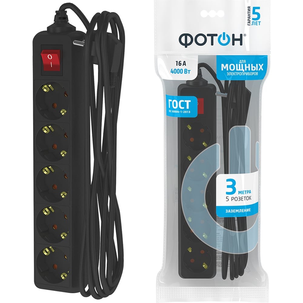 Удлинители C ЗАЗЕМЛЕНИЕМ рассчитаны на одновременное подключение приборов суммарной мощностью до 4000 Вт (номинальный ток - 16А). Они снабжены защитными шторками, прикрывающими контакты, для обеспечения дополнительной безопасности. Провод 3х1,0мм (квадратных) - сечение проводника 1,0 мм (квадратных). Латунная контактная группа обеспечивает высокую электропроводность и максимально плотный контакт со штырями вилки подключаемых приборов. Корпус изготовлен из термоустойчивого и ударопрочного ABS-пластика. Все удлинители ФОТОН предназначены для подключения к розеткам европейского стандарта. * Отсутствие искрения* Электро- пожаробезопасность Защитный бортик высотой 12 мм исключает риски поражения электрическим током при случайном попадании пальца в зазор между вилкой и гнездовым разъемом. Вся продукция полностью соответствуют нормам российского ГОСТ и EAC.