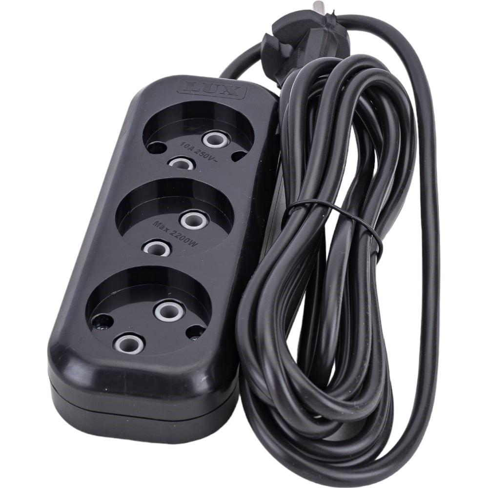 Сетевой удлинитель, черный У3-О-03 3-местный б/з, 250В, 10А, 3м LUX 4606400418948 - бытовое устройство для домашнего или офисного использования. Позволяет на расстоянии до трех метров от стационарной розетки подключить одновременно несколько электроприборов. Удлинитель выполнен из качественных и надежных материалов. Не боится механических повреждений, износоустойчив и полностью электробезопасен.