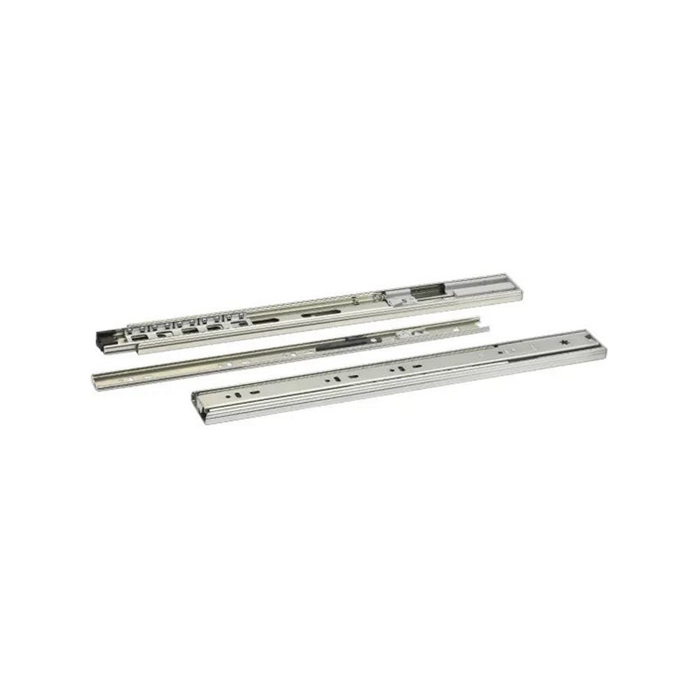 Направляющие шариковые с доводчиком полного выдвижения длиной 450 мм. Эти направляющие имеют толщину стали 1.5 мм и рассчитаны на нагрузку 35 кг. Их телескопический механизм обеспечивает полный доступ к пространству ящика а их ход мягкий и бесшумный. Система фиксации доводчика работает бесперебойно и имеет двойную защиту от случайного соскакивания. Ширина ящика не должна превышать 600 мм.