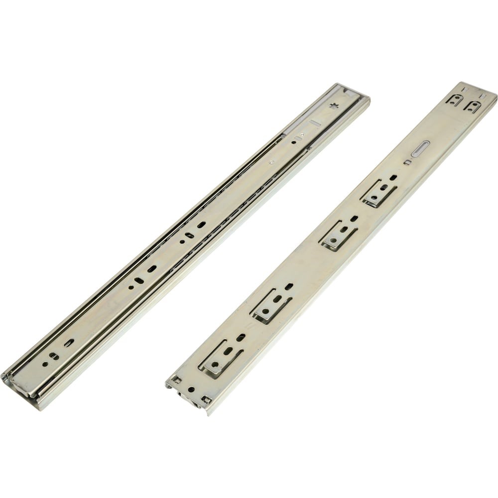 Направляющие скрытого типа имеют систему полного выдвижения и встроенный доводчик. Направляющие крепятся к ящику при помощи пластикового фиксатора. Размер: 450 мм.
