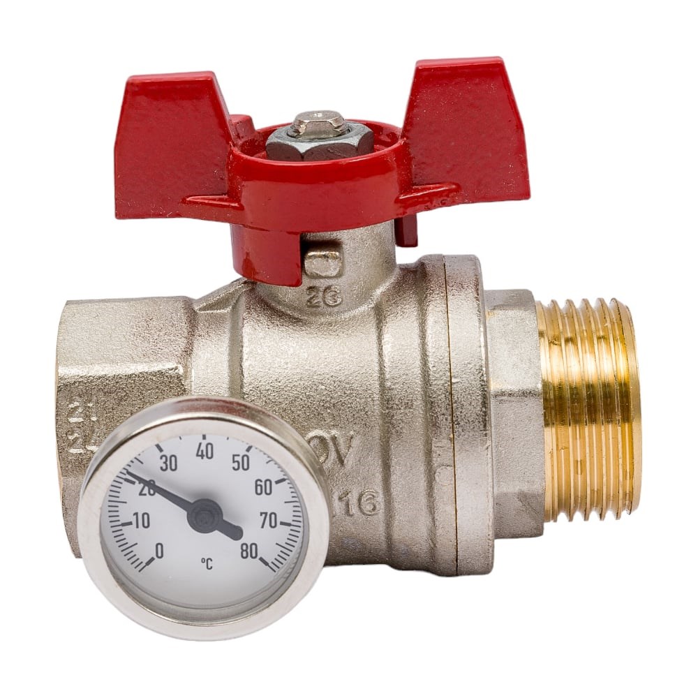 Шаровой кран Oventrop Ду25 с плоским уплотнением 1406484 , с термометром (0 - 80 C), с красной рукояткой (бабочка).