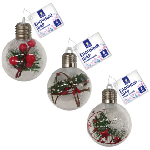 Шары представлены с наполнением в 3 дизайнах, диаметром - 8см. Внутри шаров находится светодиод. Работают от 3 кнопочных батареек «таблеток» типа LR44 в колпачке-подвесе (входят в комплект), включаются/отключаются нажатием сверху. Батарейки можно заменить, открутив колпачок.