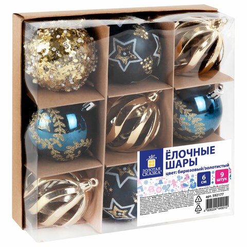 Шары ёлочные 9 шт., 6 см, "Polaris", пластик, бирюзовый/золото, ЗОЛОТАЯ СКАЗКА, 592177