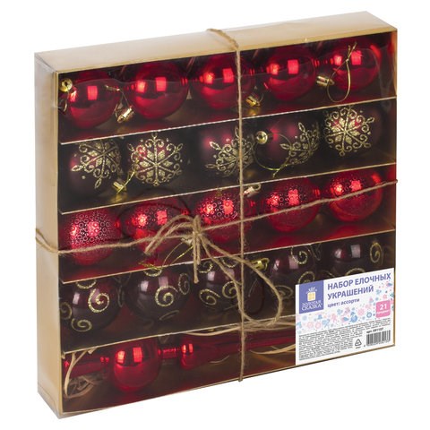 В набор входят: 5 шаров классического красного цвета с глянцевым покрытием (6 см), 5 шаров цвета "красное вино" с матовым покрытием и рисунком (6 см), 5 шаров красного цвета с текстурой (6 см), 5 прозрачных шаров винного цвета с рисунком (6 см) и наконечник на ель красного цвета с глянцевым покрытием (28 см).