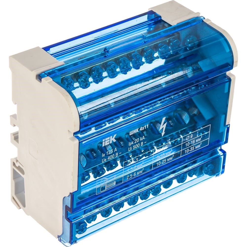 Нулевая шина в корпусе, 4х11 IEK YND10-4-11-125 изготовлена из высококачественной латуни. Шины расположены в корпусе из самозатухающего пластика. Оснащена изолятором. Установка производится в электрический щит на DIN-рейку при помощи двух винтов. Служит прибор для присоединения нулевого провода, фазного проводника или заземляющего провода. В корпусе расположено 4 шины по 11 отверстий. Каждая шина отдельно изолирована.