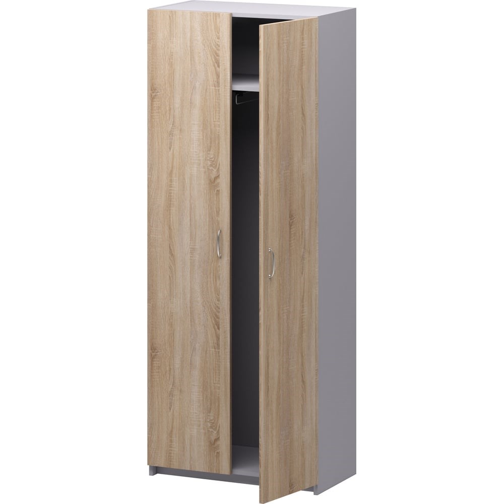 Шкаф для одежды Комфорт-Питер Бюджет 402878 402880 096 Дуб Сонома/серый 2555 предназначен для хранения одежды. Выполнен из ЛДСП, поэтому легко чистится и не требует сложного ухода. Благодаря высокой прочности прослужит долгое время. Современный дизайн шкафа впишется в любой интерьер. Шкаф оснащен выдвижной штангой и полкой для головных уборов.