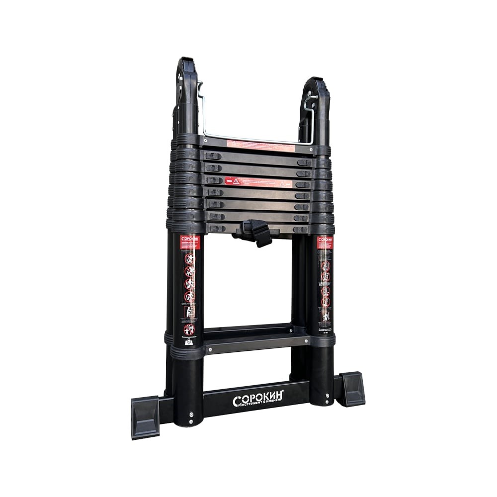 Телескопическая алюминиевая шарнирная лестница – компактная и надежная. Она универсальна: может применяться как двусторонняя стремянка и как приставная лестница. Ее основное преимущество– выдвижная конструкция, которая в сложенном состоянии компактна и не требует много места при хранении (поместиться в шкаф, на балкон, под кровать) и при перевозке (умещается в легковой автомобиль). При небольшом весе, из-за облегченного алюминиевого каркаса, лестница способна выдерживать нагрузку до 150 кг. Соединительные механизмы обеспечивают простоту обращения, а надежные материалы – длительную эксплуатацию. Благодаря телескопическому выдвижению секций от перекладины к перекладине возможно применение на лестницах, уступах, неровных поверхностях без дополнительных принадлежностей. Противоскользящие двухкомпонентные опорные заглушки препятствуют скольжению по гладкому полу. Перед использованием обязательно проверьте правильность установки лестницы! Соблюдайте угол наклона к стене (65-75°) и обязательно используйте страховочные пояса и другие страховочные приспособления!!! ВНИМАНИЕ!На каждой ступени имеются пластиковые фиксаторы. Лестница пригодна для использования только тогда, когда все фиксаторы встанут на свои места и защелкнутся. Шарниры должны быть заблокированы перед использованием лестницы!Фиксированное положение шарнира - 30, 105 и 180 градусов! Механизмы блокировки издают характерный щелчок при использовании, но, несмотря на это, ВСЕГДА визуально проверяйте, что рычаги заблокированы.