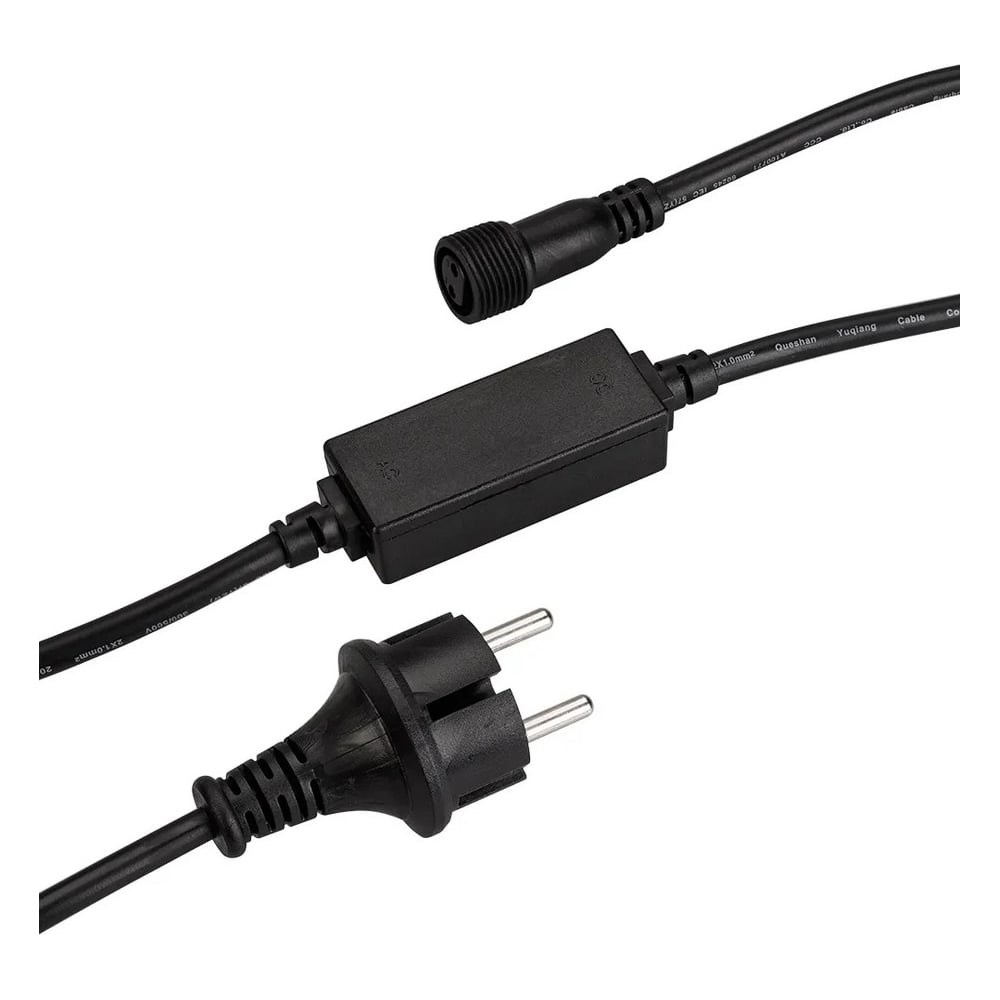 Шнур питания специально разработан для подключения светодиодных гирлянд с эффектом мерцания (FLASH). В комплект входит шнур питания с вилкой европейского стандарта (IP44), 2pin разъем для подключения к гирлянде, а также выпрямитель AC/DC (1.6А). Оболочка из черного ПВХ придает ему элегантный внешний вид. Длина провода составляет 1,5 метра, что позволяет удобно располагать гирлянду.