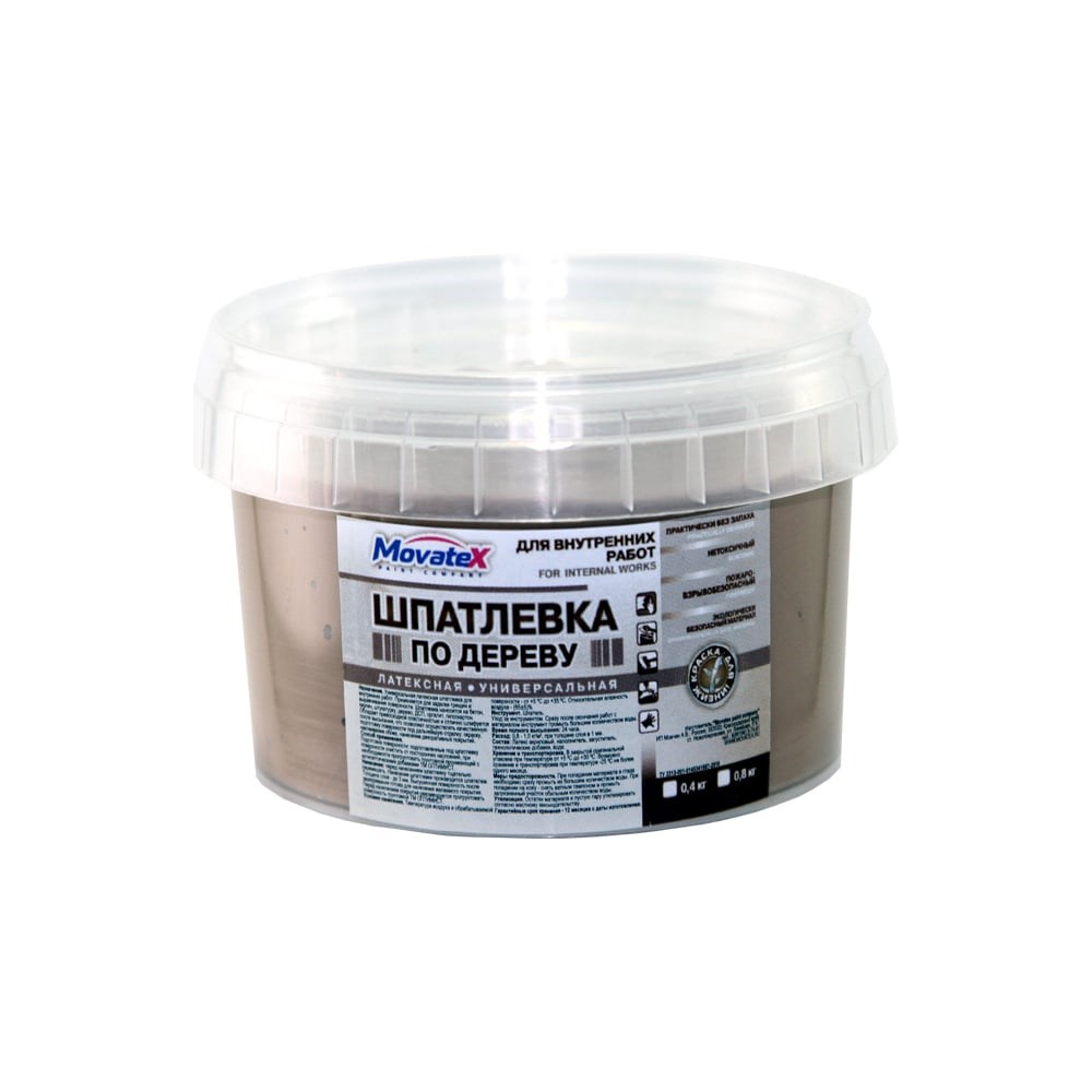 Шпаклевка по дереву (0.8 кг; тик) Movatex Т16172 предназначена для внутренних работ. Используется для заделки трещин и выравнивания поверхности. Подходит для нанесения на бетон, кирпич, штукатурку, дерево, ДСП, оргалит, гипсокартон. Имеет превосходную пластичность и отлично шлифуется после высыхания, что позволяет осуществлять качественную подготовку поверхности под дальнейшую отделку: окраску, наклеивание обоев, нанесение декоративных покрытий.