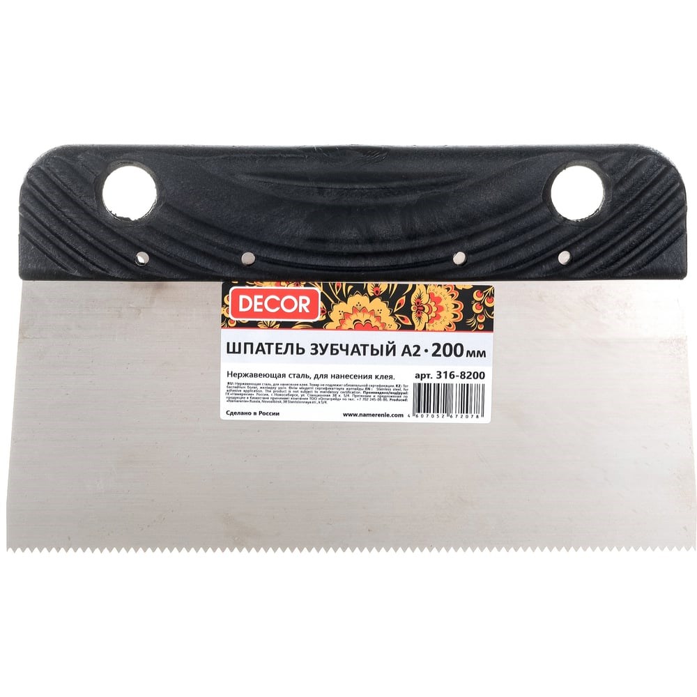 Шпатель DECOR зубчатый А2 длина 200 мм, ширина 80 мм, толщина 0,45 мм, зуб 2 мм, пласт. ручка, нерж. сталь, 316-8200 удобен для нанесения клеевых составов. Имеется удобная рукоять. Толщина полотна позволяет сохранить гибкость инструмента. Изделие позволяет быстро обработать большую поверхность за счет значительной ширины полотна.