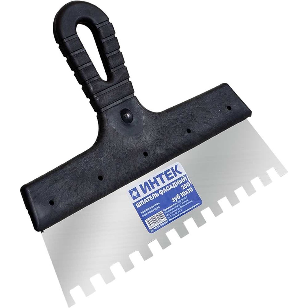 Фасадный шпатель ИНТЕК 250 мм, зуб 6х6, с пластиковой ручкой, нержавеющая сталь 8972 используется для нанесения и выравнивания клеевых и штукатурных составов на поверхности большой площади. Инструмент оснащен эргономичной пластмассовой ручкой, что обеспечивает надежный захват инструмента и возможность продолжительной работы без усталости рук. Полотно шпателя выполнено из высоконагартованной нержавеющей стали толщиной 0,4 мм, 1500н/мм. Сталь данной марки обладает улучшенными механическими свойствами, исключающими деформацию полотна в процессе работы.